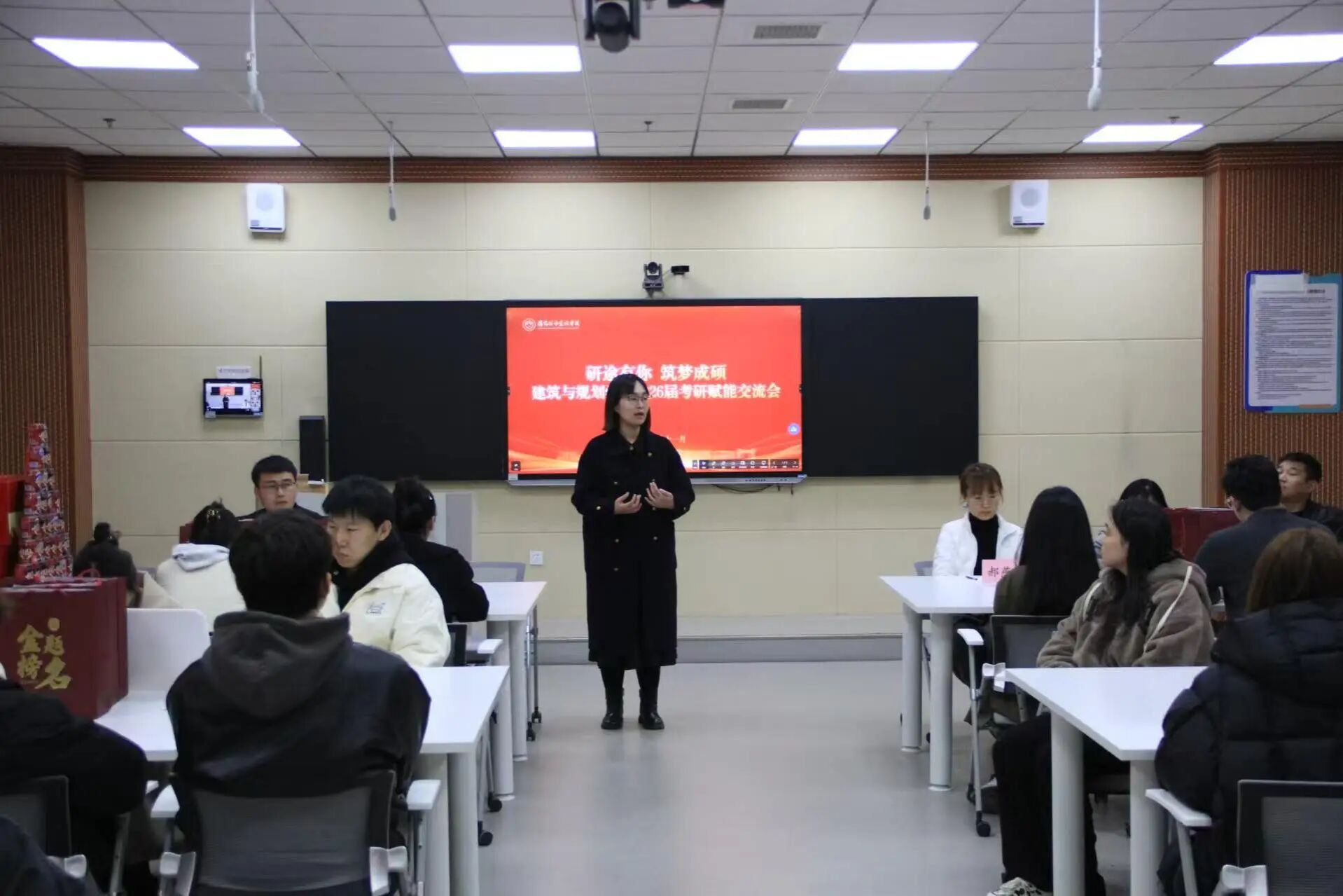 为坚定考研学子信念,助力备考征程,11月13日,建筑与规划学院在创新楼101教室举办“研途有你 筑梦成硕”2026届考研赋能交流会。学院党总支书记、副院长牛艺,团委书记、学工办主任陆鹏程,各专业教师代表、毕业年级辅导员及考研学生代表参会。会议由陆鹏程主持。